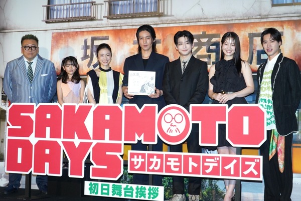 元・凄腕の殺し屋である主人公・坂本太郎役のふくよか体型を、特殊メイクとスーツで演じきった目黒。この日、初めて普段のスタイルの目黒と会ったという妻役の上戸彩は「ポーっと顔が赤くなっちゃう」と照れ笑い。相棒・朝倉シン役の高橋文哉は、特殊メイクをしていない目黒に緊張するキャストやスタッフが続出していることに「僕が最初に“普段の目黒さんを前にすると緊張する”と言い出したんです」とニヤリ。
