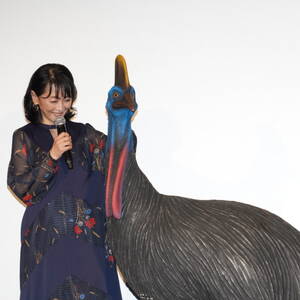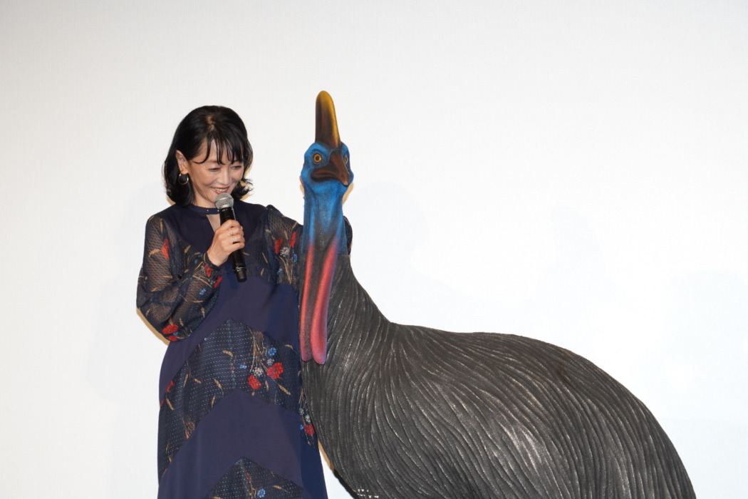 この日は、ほぼ実物大のヒクイドリの模型も登場。ヒクイドリをイメージした色でそろえたという浴衣姿の6人もその大きさに驚いていた。